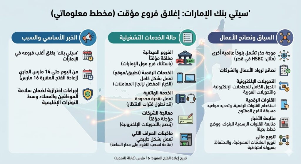 وضح سيتي بنك أن قرار الإغلاق المؤقت يشمل ثلاثة من مبانيه الرئيسية في الإمارات، بما في ذلك مكاتبه في مركز دبي المالي العالمي وحي عود ميثاء، مع استمرار تقديم الخدمات للعملاء عبر القنوات الرقمية. وتشمل الترتيبات التشغيلية ما يلي: