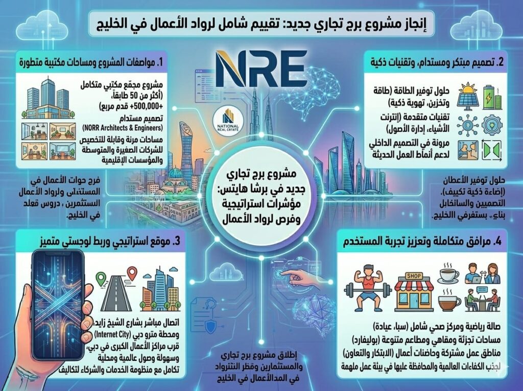وأضاف: “أصبحت منطقة برشا هايتس مركزاً تجارياً حيوياً، وسيساهم المشروع الجديد في تعزيز مكانة المنطقة عبر تقديم بيئة عمل حديثة تلبي تطلعات الشركات العالمية اليوم”.