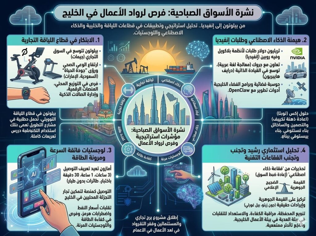 نصيحة لرواد الخليج: راقب إعلانات الشركات التقنية الكبرى كمؤشر مبكر لاتجاهات الاستثمار. فما تعلنه إنفيديا اليوم قد يكون فرصة مشروعك غدًا.