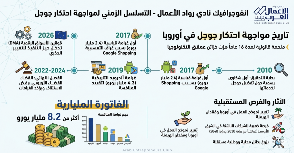 - 2026 – الفصل النهائي: القضاء الأوروبي يرفض آخر استئناف لجوجل، ويؤكد الغرامات المليارية، مما يفتح الباب لمطالبات بتعويضات مدنية من الشركات المتضررة.