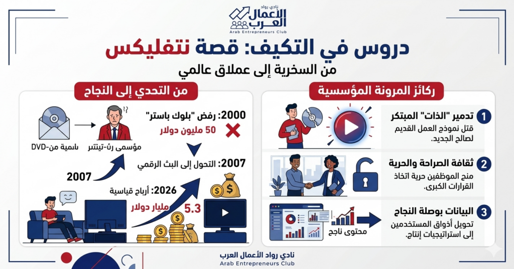 في عالم الأعمال، لا ينجو الأقوى ولا الأسرع، بل الأكثر قدرة على التكيف. وتعد قصة “نتفليكس” (Netflix) النموذج الأبرز عالمياً للمرونة المؤسسية؛ فخلف الأرباح الصاعقة التي أُعلنت في الربع الأول من عام 2026، والتي بلغت 5.3 مليار دولار، تكمن سلسلة من القرارات الجريئة واللحظات التي كادت أن تنهي وجود الشركة تماماً.