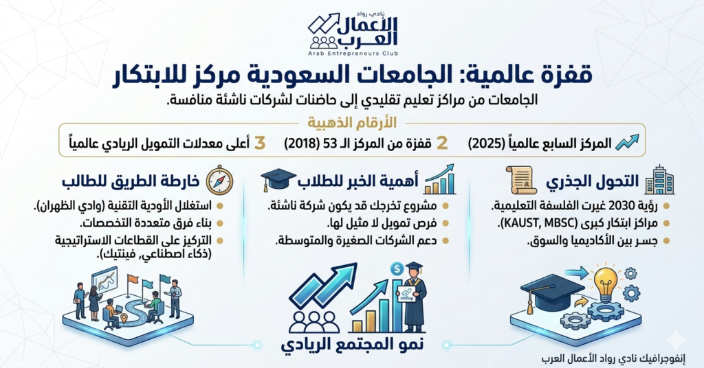لم يكن صعود المملكة العربية السعودية إلى المركز السابع عالمياً في مؤشر ريادة الأعمال الجامعية لعام 2025 (بعد أن كانت في المركز 53 عام 2018) مجرد أرقام في تقرير المرصد العالمي (GEM)؛ بل هو إعلان رسمي عن تحول الجامعات السعودية من مراكز للتعليم التقليدي إلى حاضنات ابتكار كبرى.