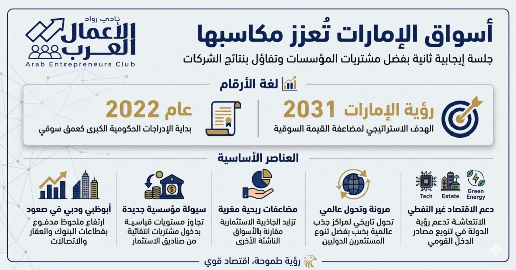 تتماشى هذه الانتعاشة مع مستهدفات “رؤية نحن الإمارات 2031” التي تسعى إلى رفع القيمة السوقية لأسواق المال الوطنية لتنافس عالمياً.