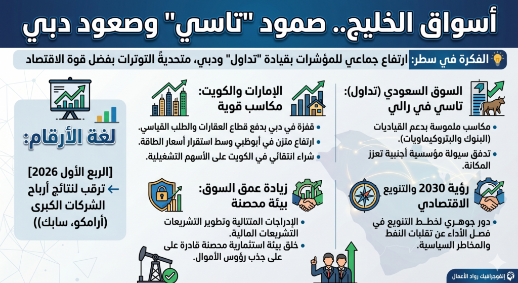 اقتصادياً، تلعب “رؤية السعودية 2030” وخطط التنويع الاقتصادي في الإمارات وقطر دوراً جوهرياً في فصل أداء أسواق المال عن تقلبات أسعار النفط والمخاطر السياسية المباشرة.