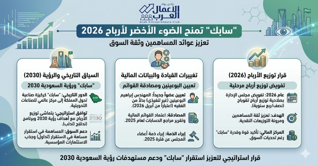 أقرت الجمعية العامة العادية للشركة السعودية للصناعات الأساسية “سابك”، خلال اجتماعها الأول لعام 2026، قراراً استراتيجياً يقضي بتفويض مجلس الإدارة بصلاحية توزيع أرباح نقدية مرحلية (نصف سنوية أو ربع سنوية) عن العام المالي 2026.