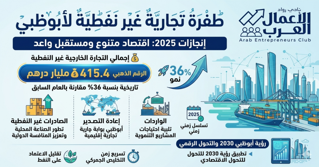 سجلت التجارة الخارجية غير النفطية لإمارة أبوظبي طفرة استثنائية خلال عام 2025، حيث بلغت قيمتها الإجمالية 415.4 مليار درهم إماراتي، محققة نمواً قياسياً بنسبة 36% مقارنة بالعام السابق.
